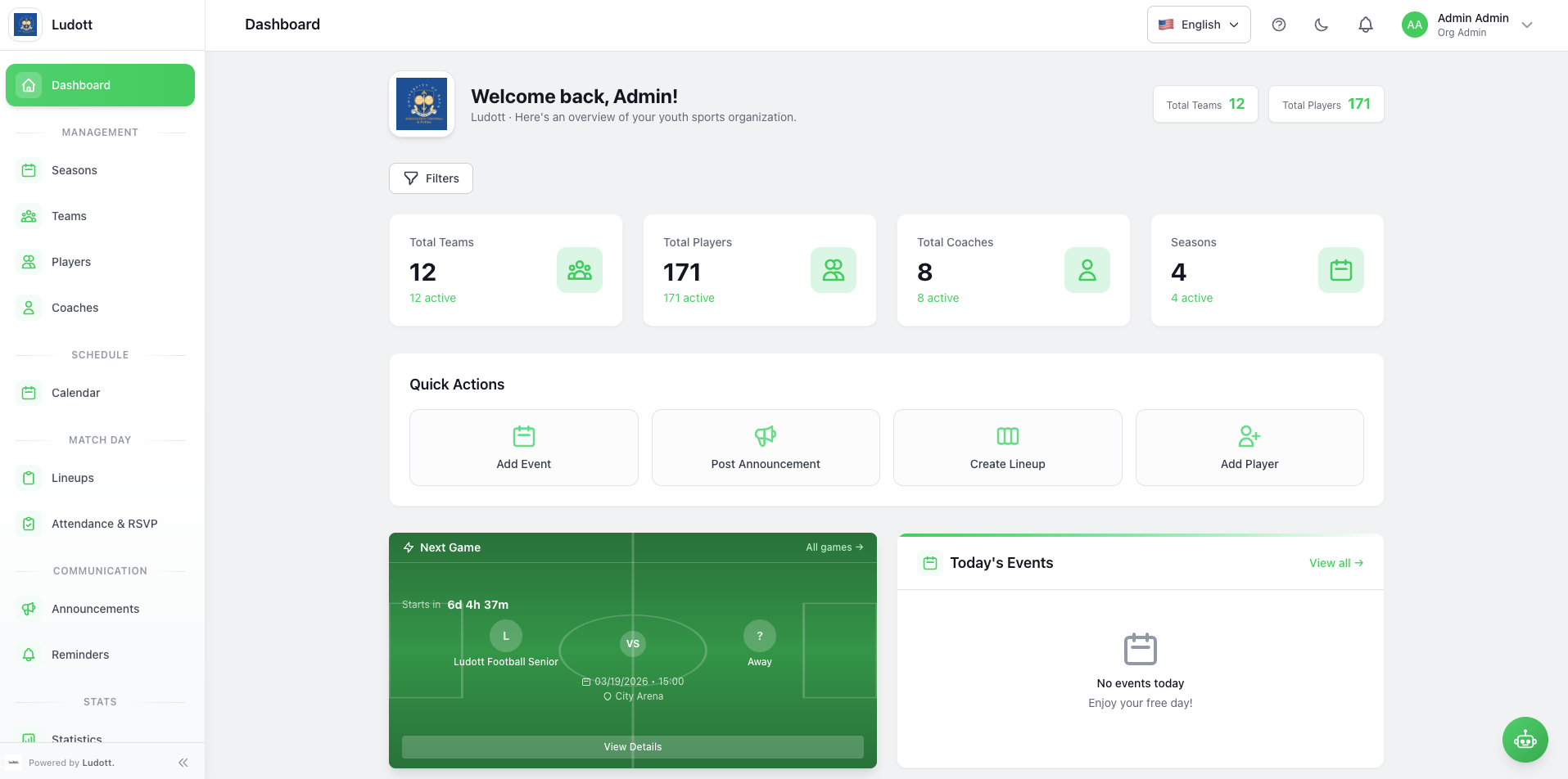 Real-time attendance across all teams. See at a glance who's confirmed for every practice, game, and event.